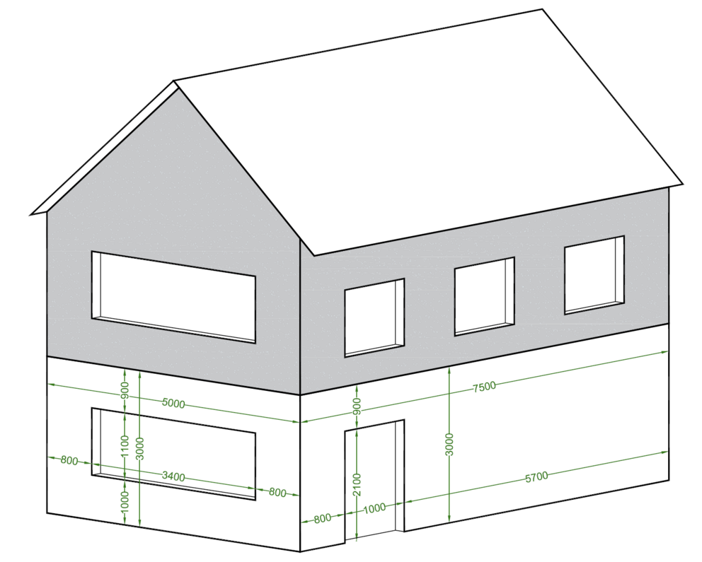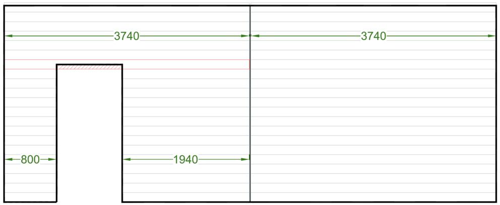 Utskjæringer, som vinduer og dører, som delvis stikker inn i en profil, kan ikke tas med i betrakningen ved bestemmelse av materialet og tilpasses av kunden (område merket med rødt).