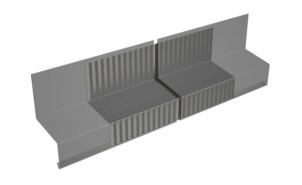 Etter fullført underkonstruksjon, start med montering av koblingsstrimmel, dekselstrimmel, perforert plate og værskinne. Nedslagsdannelsen av værbeinet skjer på en overlappende og limt måte. Den (skjulte) underliggende tetningslisten er kuttet inn slik at den overliggende tetningslisten kan monteres.