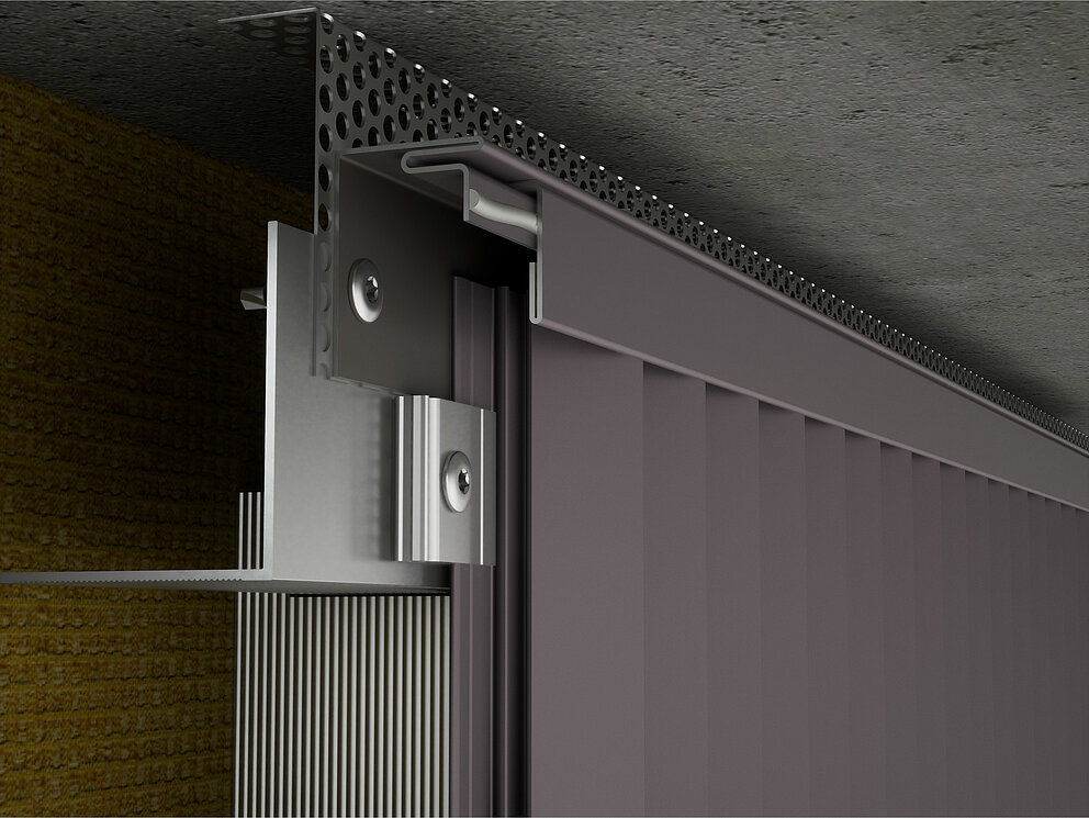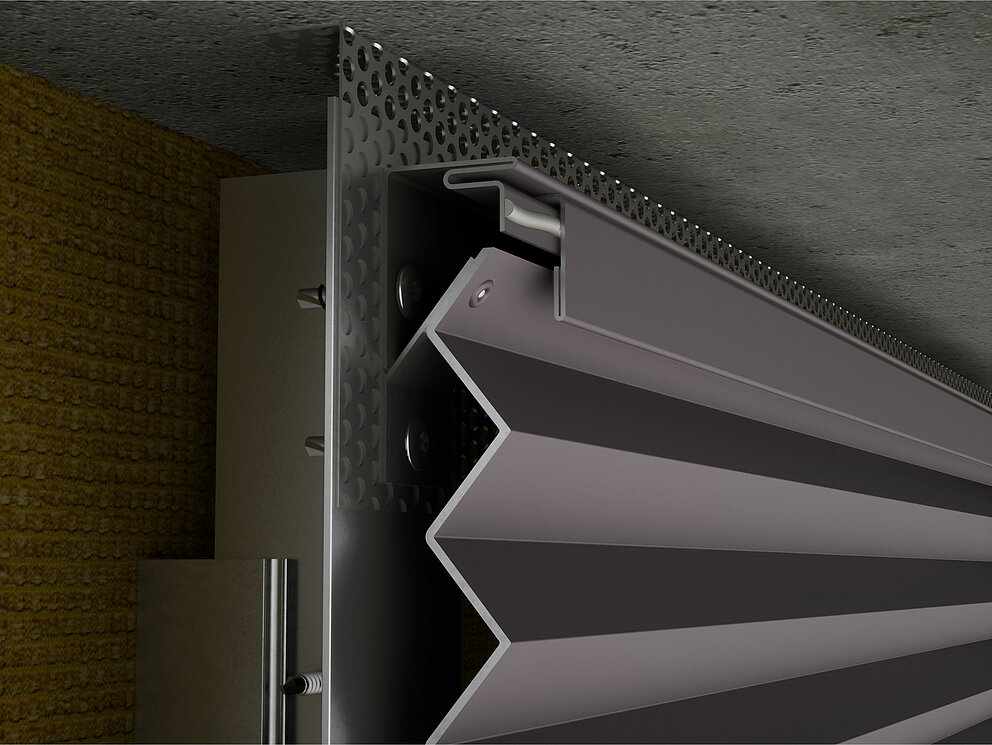 For å ventilere fasaden på riktig måte, må det være en avtrekksluftåpning i den øvre enden. Monter en perforert plate med en 90° bøy ved avtrekksluftåpningen (f.eks. takutstikker) for å oppnå en høyere stivhet.