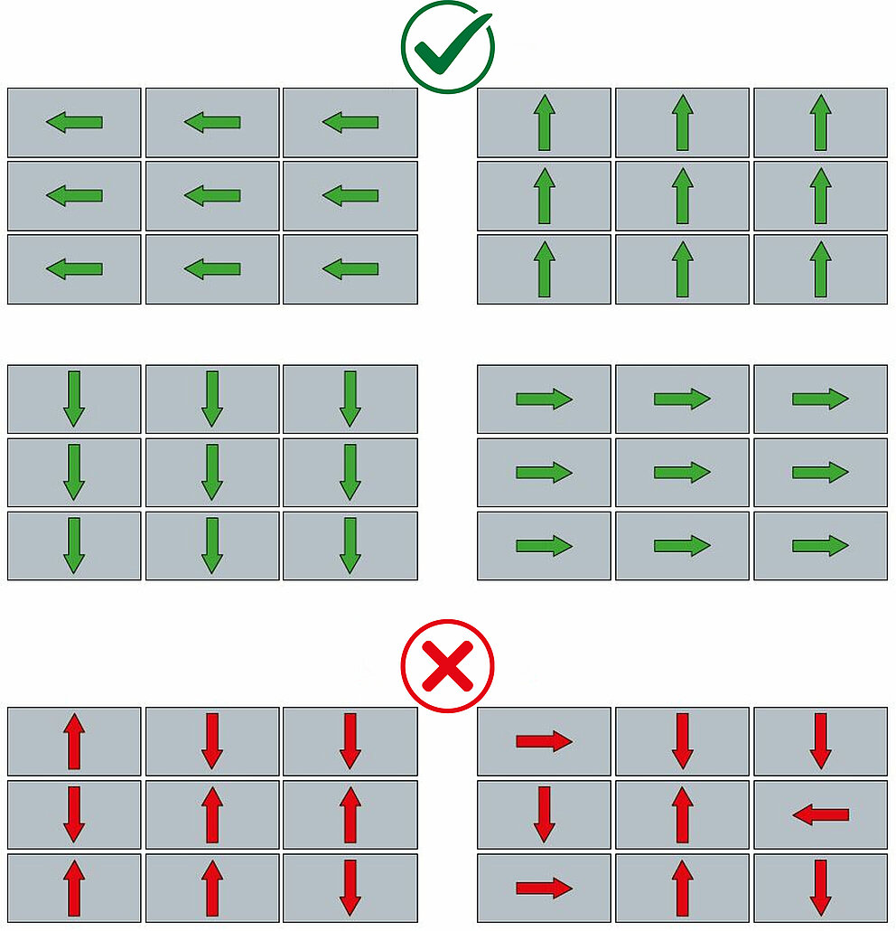 På beskyttelsesfolien og på baksiden av platene er det trykt retningspiler som angir lakkeringsretningen.