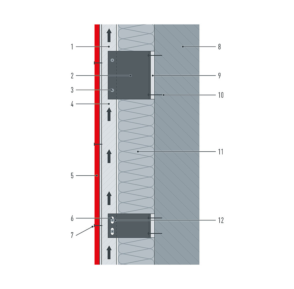 værbelastninger unna den primære konstruksjonen. Konstruksjonen av den opphengte, ventilerte fasaden kjennetegnes av en klar, funksjonell separasjon av de enkelte komponentlagene. Bakre ventilerte ytterveggbelegg består i hovedsak av flere komponenter som er tilpasset hverandre med hensyn til konstruksjon. Fukt fjernes via det bakre ventilasjonsnivået og holder isolasjon og murverk tørt.
