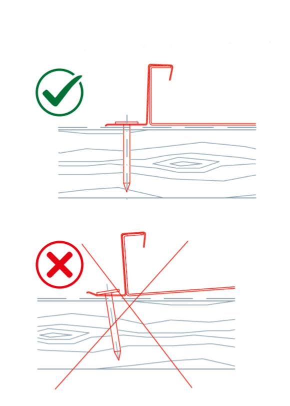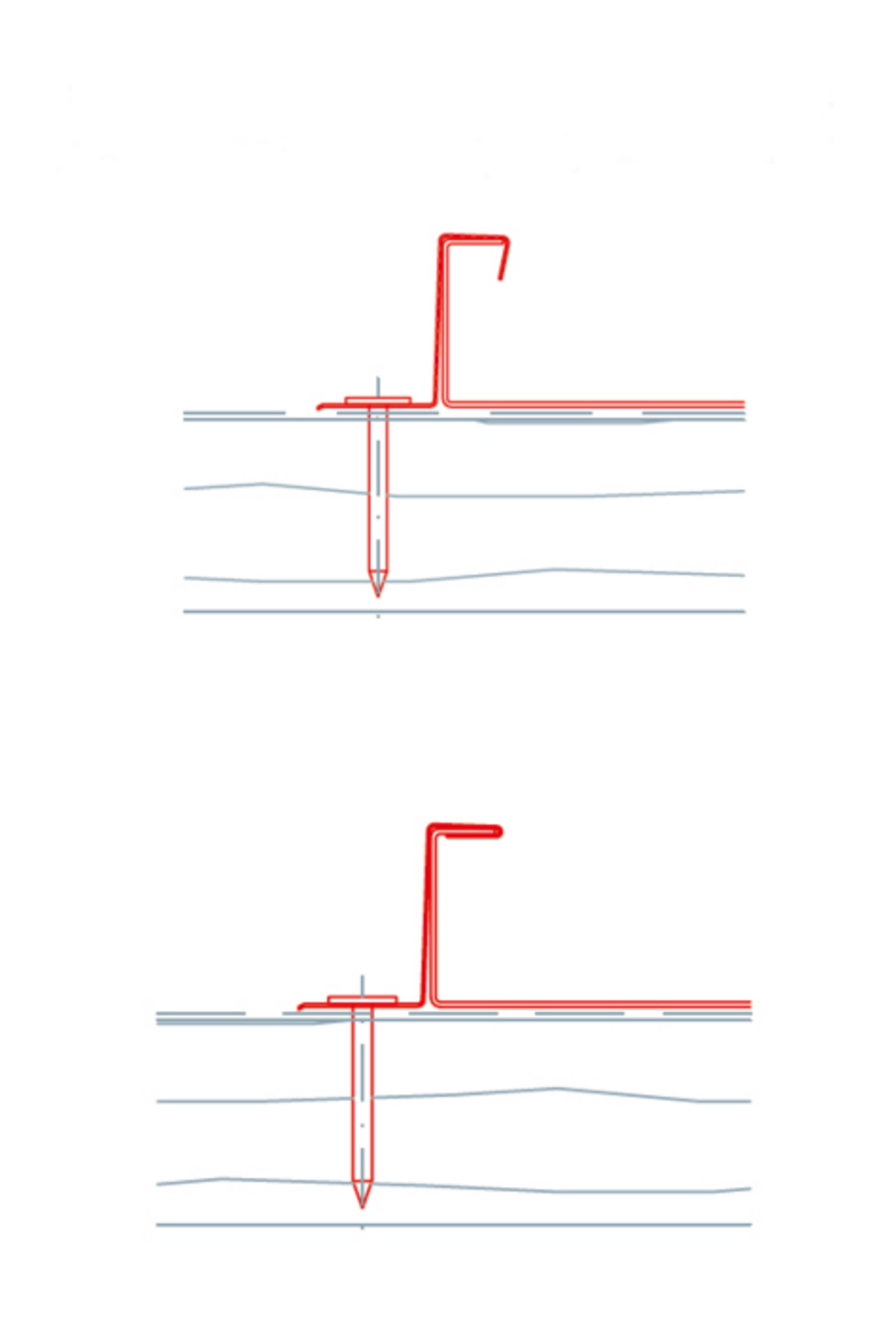 Når du fester PREFA rustfrie vinkelfalsfeste- og vinkelglideklammer, sørg for at rillespikrene er tilstrekkelig forsenket for festing og ikke stikker ut over høyden på rillesporet, for å unngå trykk- og slitasjepunkter i den lagte tekkingen. For å feste PREFA vinklede stående sømbraketter kreves det 2 stk til hvert feste. Bruk PREFA rustfrie rillespiker. For å feste PREFA vinkelglideklammer kreves det 3 stk. per klammer. Bruk PREFA rustfrie rillespiker.