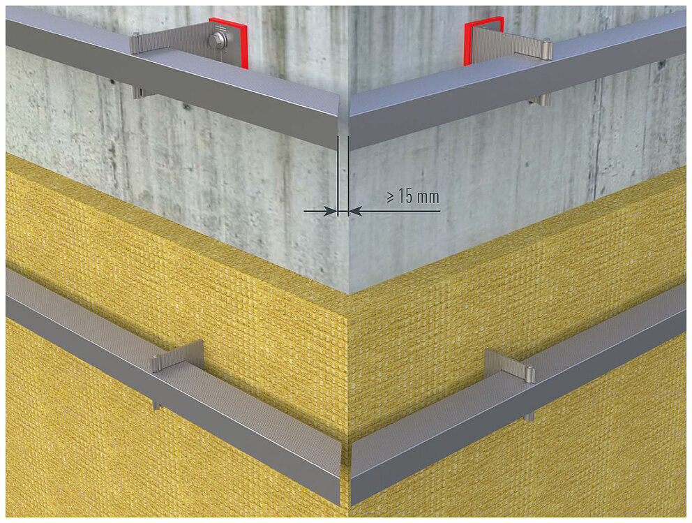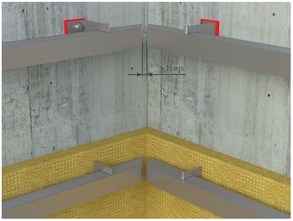Når du installerer indre eller ytre hjørneprofiler, må du sørge for at underkonstruksjonens støtteprofiler ikke støter i hjørneområdet. Hold en avstand på minst 15 mm. Ved festing må det tas hensyn til en ekspansjonsbasert enhet med en klar definisjon av faste og glidende punkter.