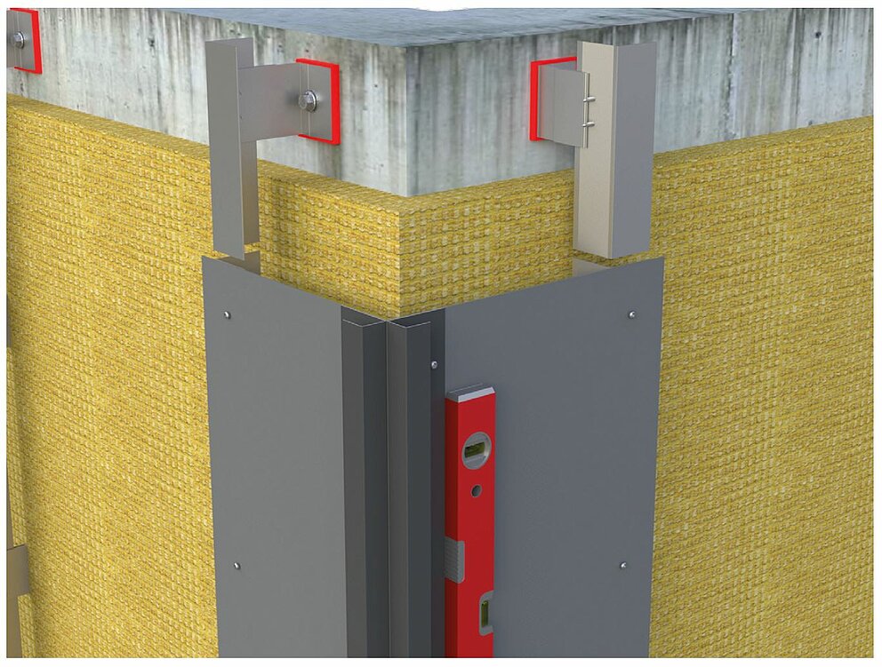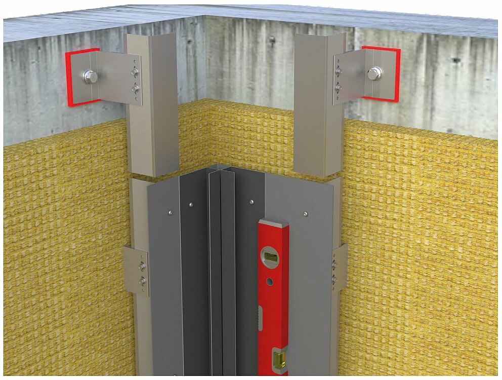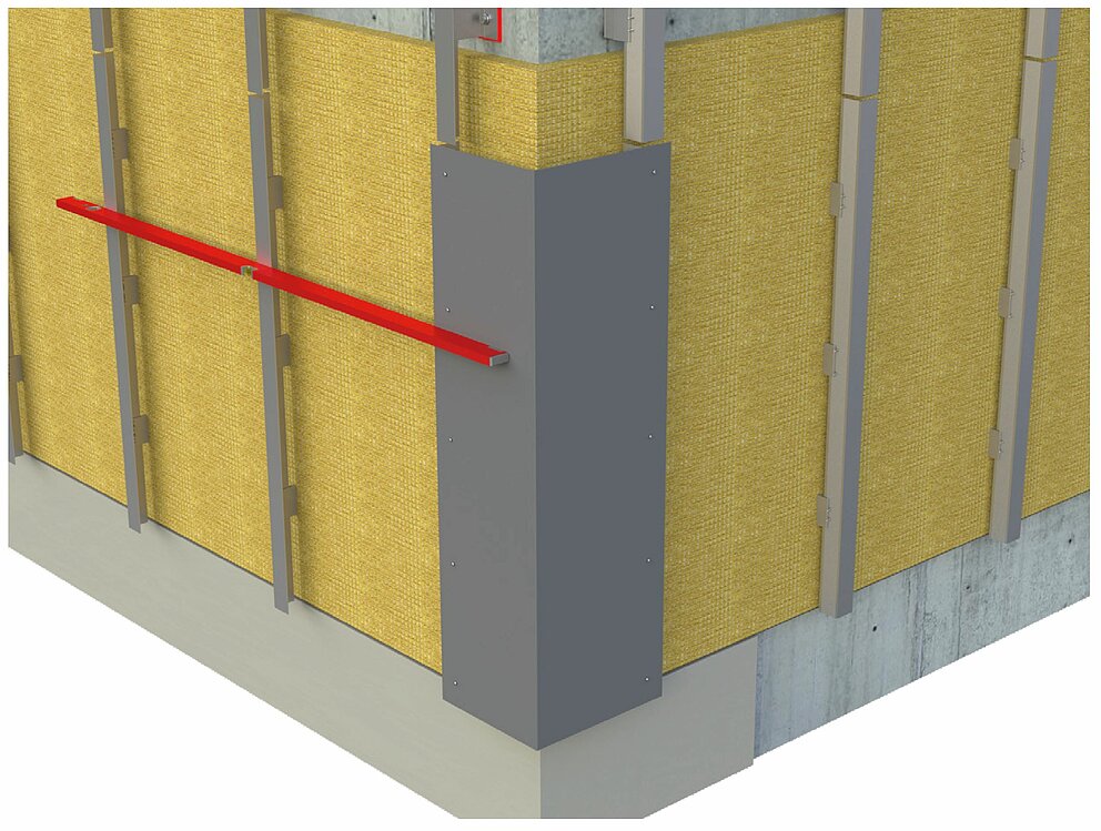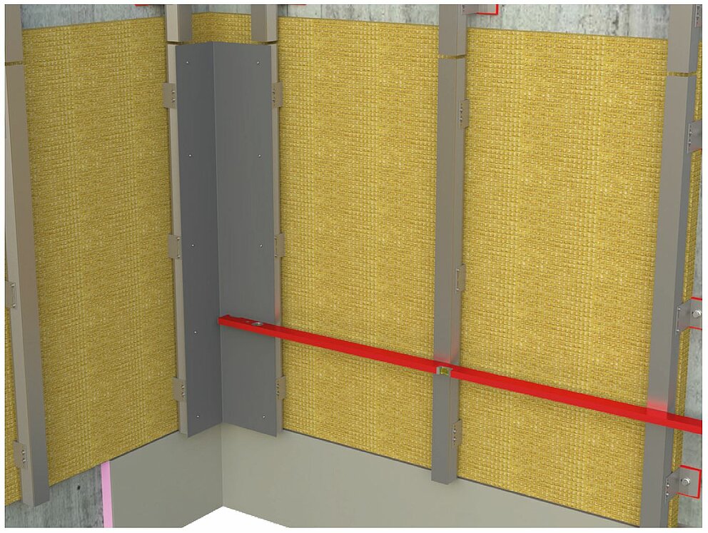 Forbered underkonstruksjonen for horisontal profillegging for installasjon av det indre eller ytre hjørnet. For å montere de indre eller ytre hjørneprofilene, må du først koble den vertikale underkonstruksjonen med en bærevinkel laget av 2 mm tykke aluminiumsplater eller galvanisert stålplate (1 mm). Når du monterer underkonstruksjonen, må du sørge for å plassere støtteprofilene lenger innover tilsvarende materialtykkelsen på bærevinkelen for å sikre flatheten i underkonstruksjonen.
