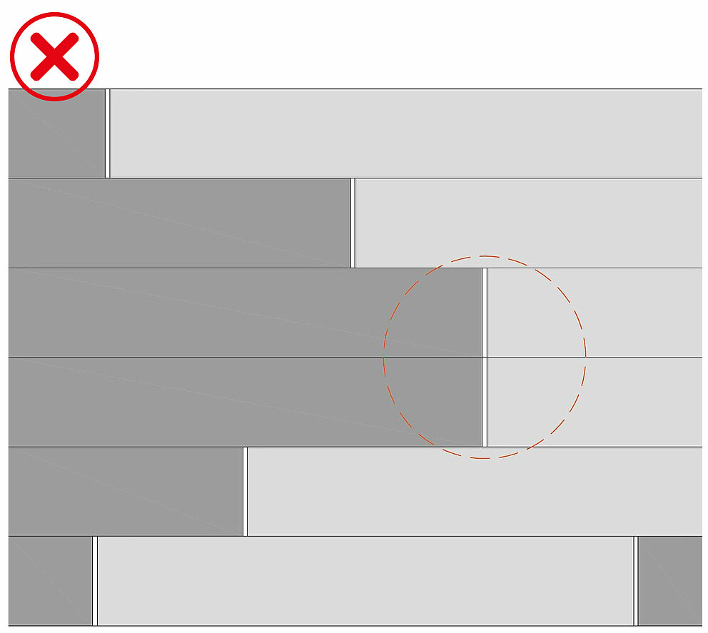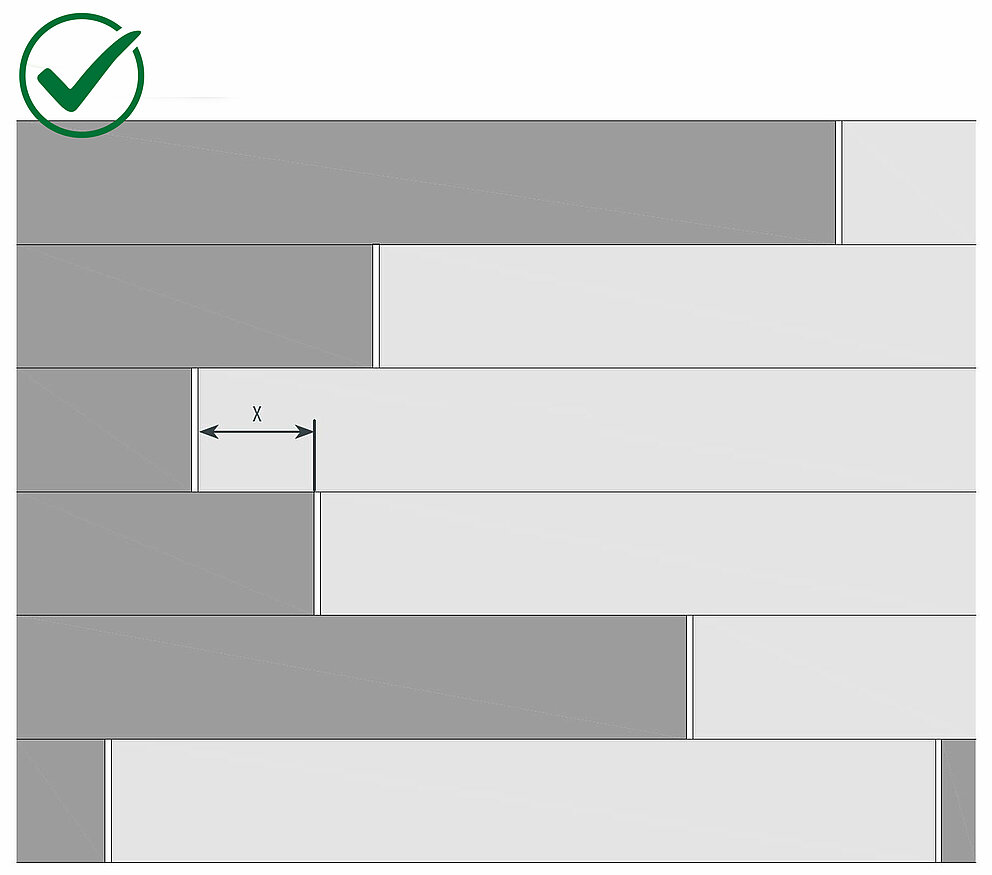 PREFA anbefaler at forskyvningen (x) er minst en avstand som tilsvarer den installerte bredden (BB) (f.eks. når det gjelder siding 138 × 0,7 mm = min. forskyvning 138 mm):