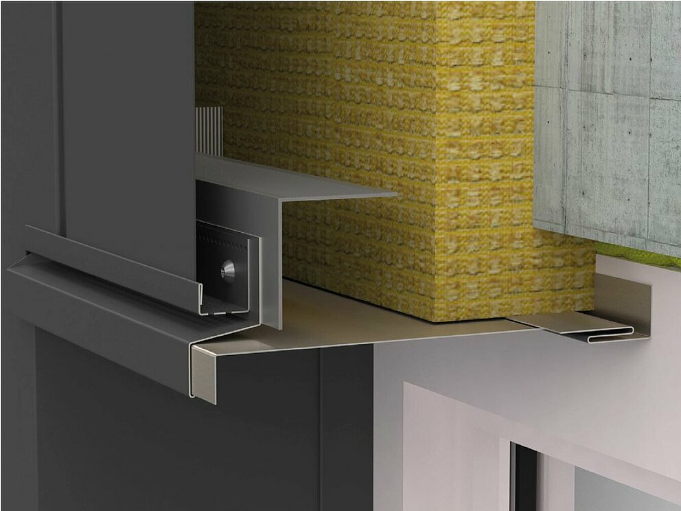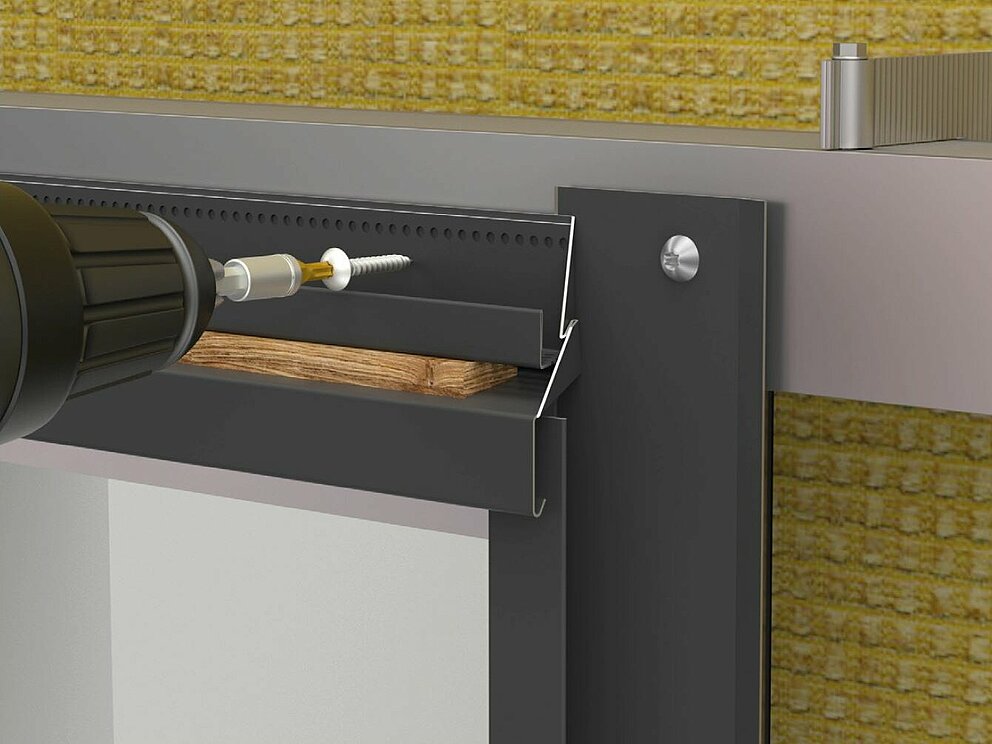 Festebrakettene for soffit-platen skrues deretter på underkonstruksjonen til venstre og høyre for vinduet. Samtidig festes koblingslistene for støpeplaten og koblingsstrimmelen for vindusforlengelsen også til vindusrammen eller murverket.