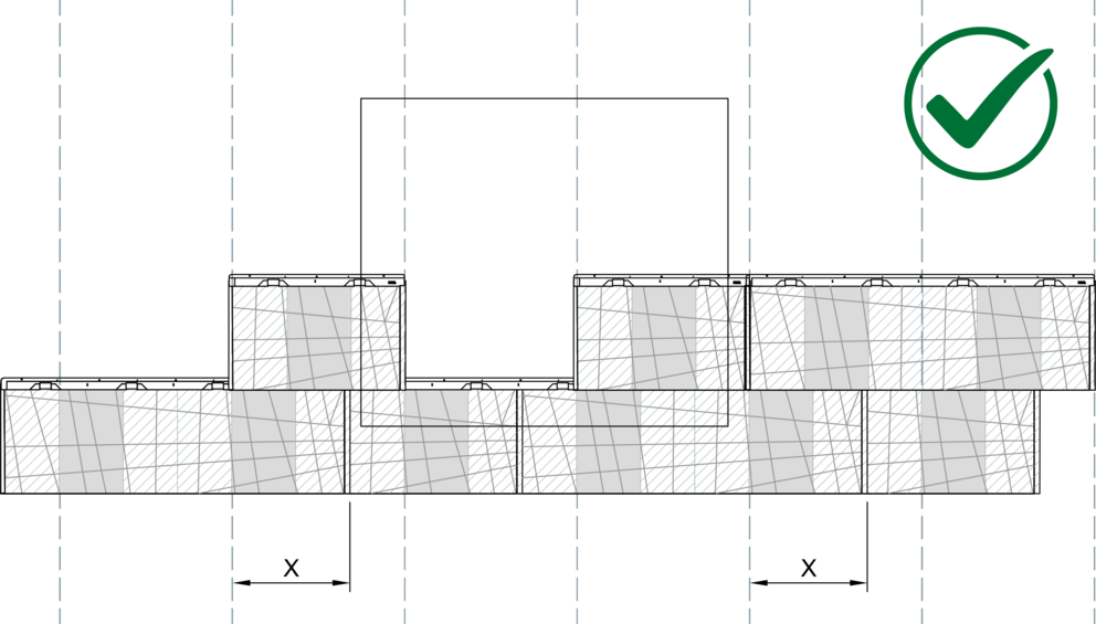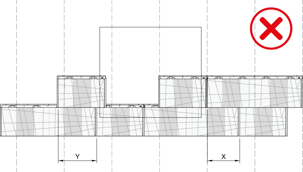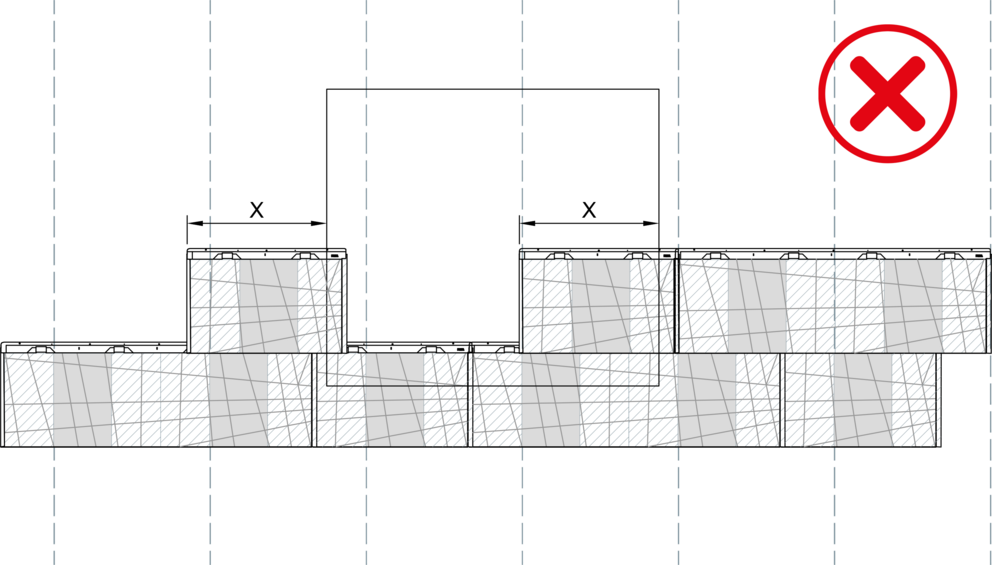 Ved installasjon av fasadepanel FX.12 må ingen vinkelfals ligge rett over en annen, og det skal være en sideforskyvning på minst 220 mm. Når store og små FX.12-paneler kombineres, må skjøten til det første panelet i "X" -området startes med hver nye rad.