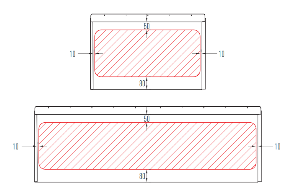 Hvis du monterer noe på fasaden (f.eks. lamper), må du ta hensyn til det tillatte monteringsområdet for fasadepanel FX.12 når du monterer dem. Hvis det ikke er mulig å vedlikeholde monteringsområdet, må en bunnplate falses inn.