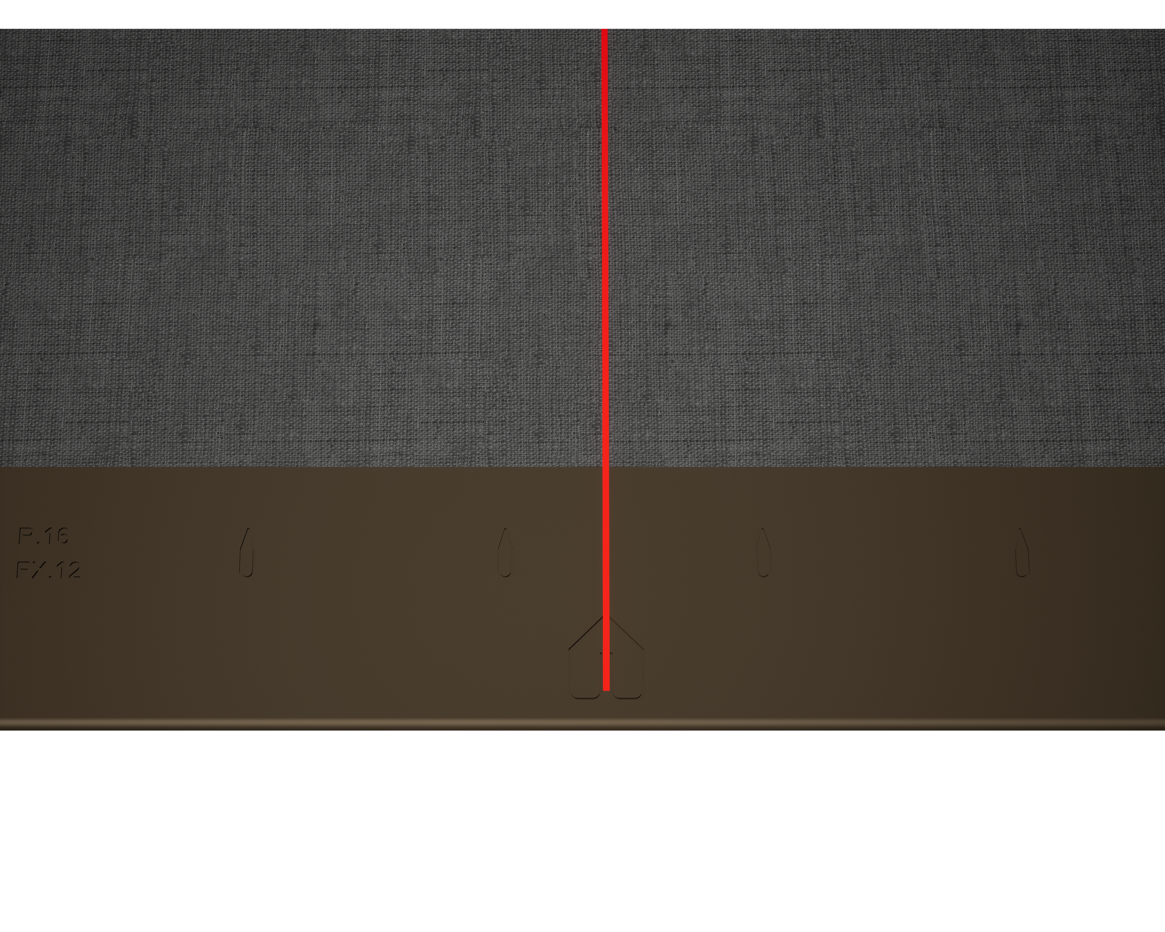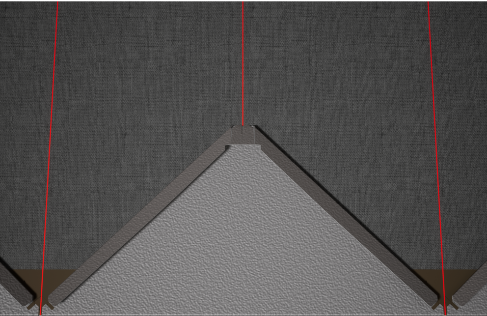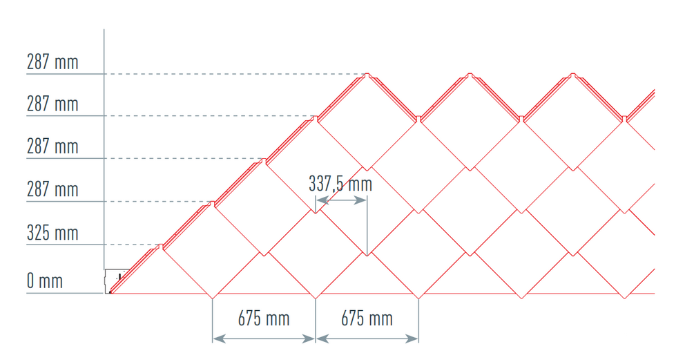 For å hjelpe til med installasjonen av PREFA-veggrombene 44 × 44, er det tilrådelig å produsere et rutenett av vertikale snorslag i en avstand på 675 mm (markeringene i kantlisten fungerer som hjelpemiddel). For å opprettholde snørelengden nøyaktig i hver rad, kan halve snørelengden også tegnes om nødvendig og kontrolleres med jevne mellomrom. Juster startplatene med hakkene (på øvre kant av startplatene) langs de vertikale snorslagene (se illustrasjonen nedenfor). Sørg for at arealet for sideoppkant (f.eks. sideavslutning eller bygningshjørner) ikke ligger midt i veggrombe 44 × 44 (ta hensyn til symmetrien i fasadeflaten).
