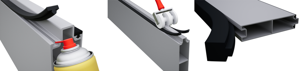 • Trykk pakningen på flomsikringselementet inn i begge sporene på oversiden av flomsikringselementet. Som monteringshjelp kan tetningsrulle og silikonspray brukes for at det skal bli lettere å presse. Påfør bunntetning på undersiden av flomsikringselementet.