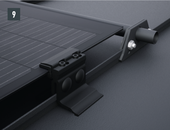 Skissen viser tre ulike varianter for montering av solcellemodul PREFALZ med 6, 8 eller 10 festepunkter. Illustrasjonen viser hvilken avstand festene skal monteres med, avhengig av foretrukket variant.
