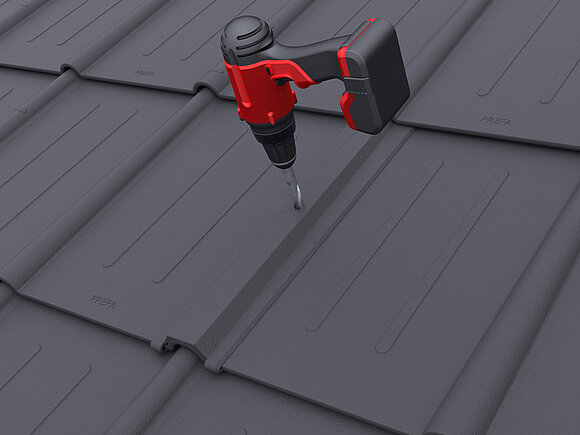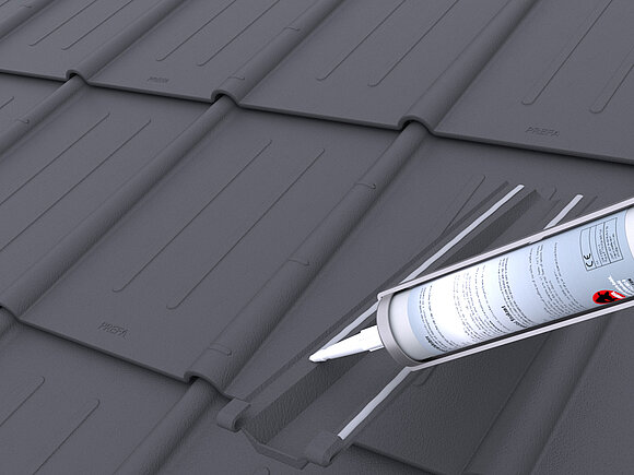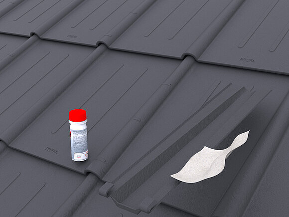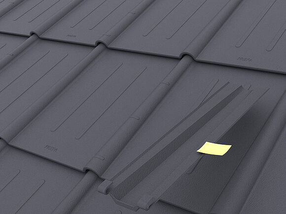 Klebeområdene på Sunny spesial og på takplaten skal slipes og rengjøres. Påfør spesiallim på den slipte og rengjorte Sunny spesial. Skyv Sunny spesial i området for overlappings- eller midtrillen inn i den øvre falsen på takplatene og vipp den ned. Skyv Sunny spesial så langt som mulig opp i falsen.