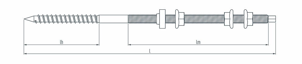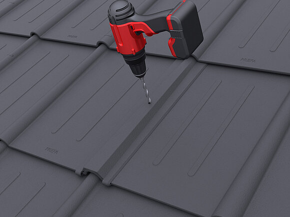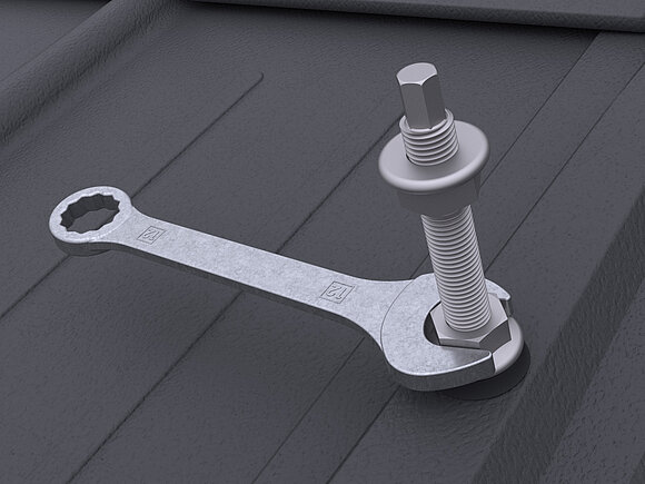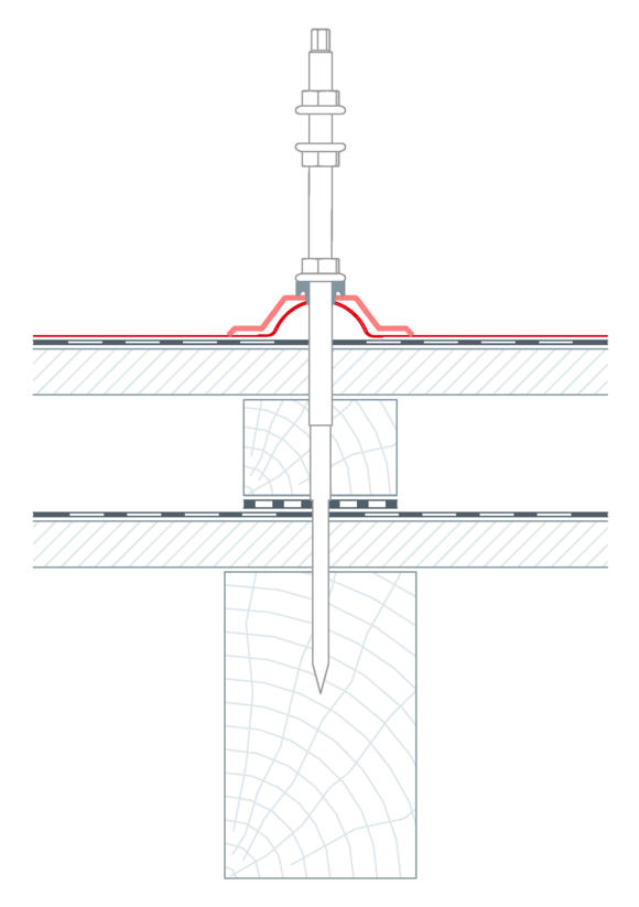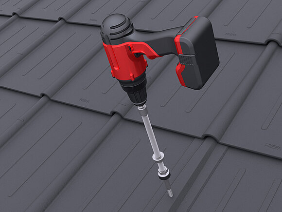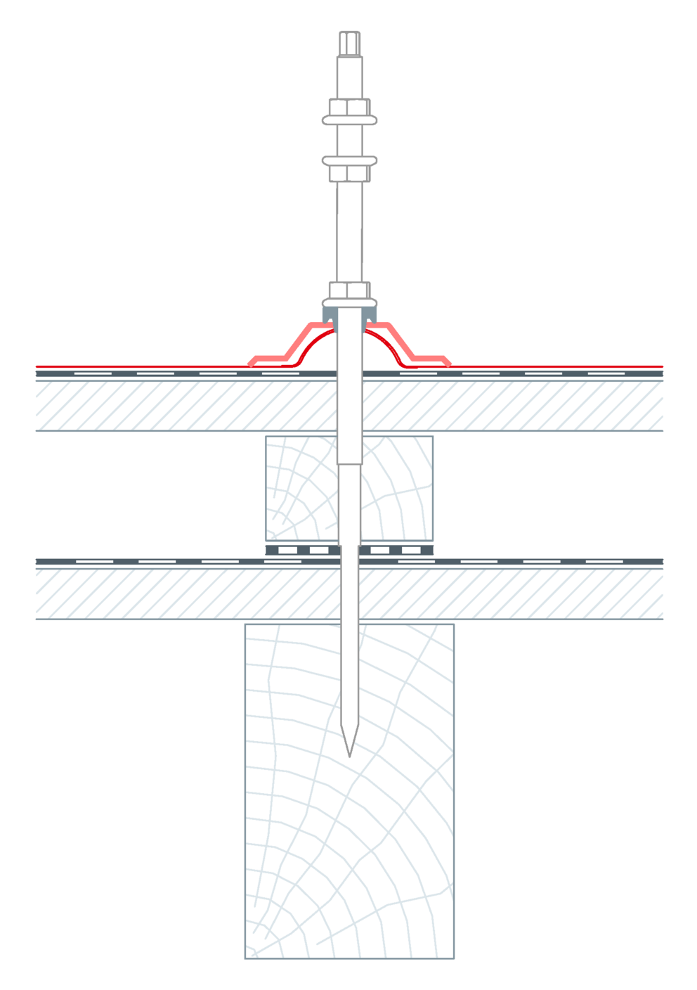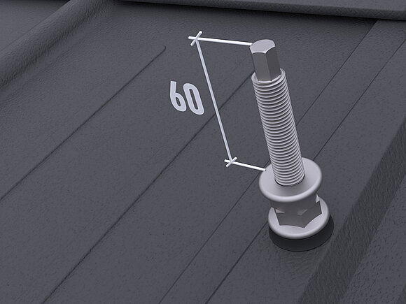 Marker posisjonen til hengebolten. Trekonstruksjon forbores med ⌀ 8 mm. Sunny spesial og takplater forbores med ⌀ 13 mm. Skru inn hengebolten med boremaskin (nøkkelpipe: SW 9). Inntrengningsdybde på den bærende underkonstruksjonen (sperrer): min. 80 mm.