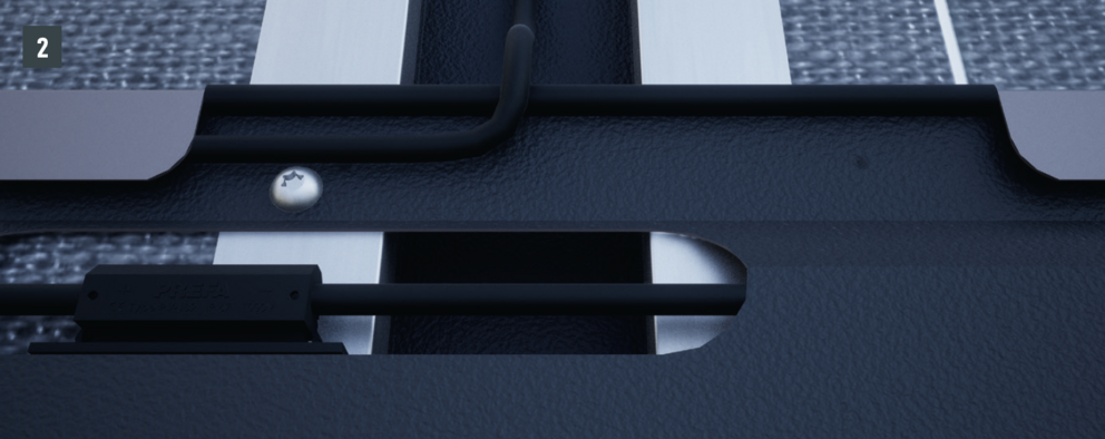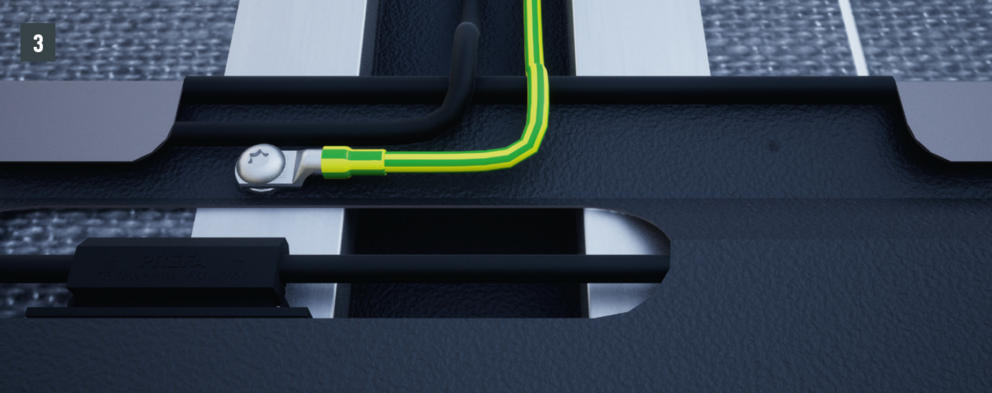 I den siste raden er den potensielle utjevningskablen skrudd fast til solcelle takplate med en skrue som ligger over kabelkanalen (se fig. 3), der stengkablene ligger i kabelkanalene og ført inn i taket.
