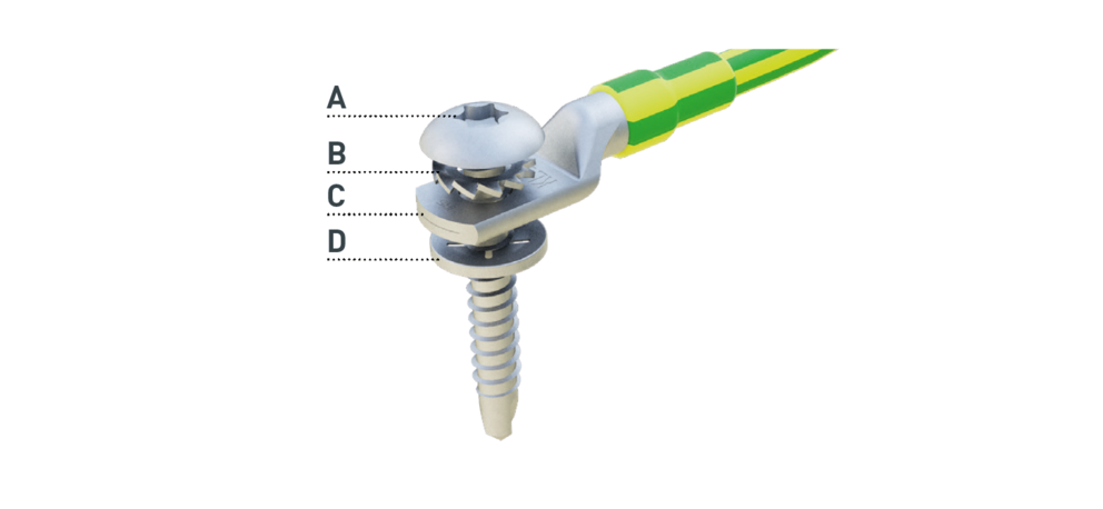 Komponenten består også av monteringsskrue (A), låsemutter (B), kontakt i rustfritt stål (C) og skruelås (D) (se figur under).