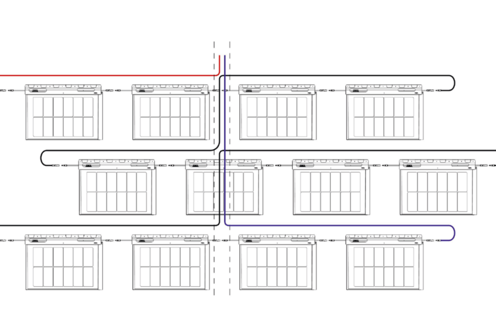 Et PREFA solcelle takplate krever ett innløp og ett utløp per kabel. I tillegg må radene med takplater kobles til hverandre med såkalte tilkoblingskabler.