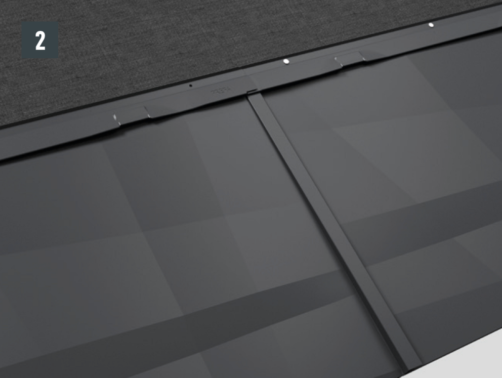 • Juster takpanel FX.12 og skyv den inn i falsene (fig. 1 + 2). Skyv den nedre kanten av panelet litt med hammerhåndtaket.