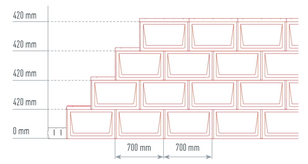 Loddrett oppmerking: 700 mm (annenhver rad forskjøvet med 350 mm)