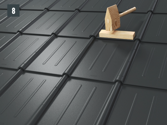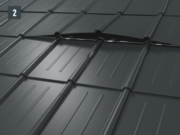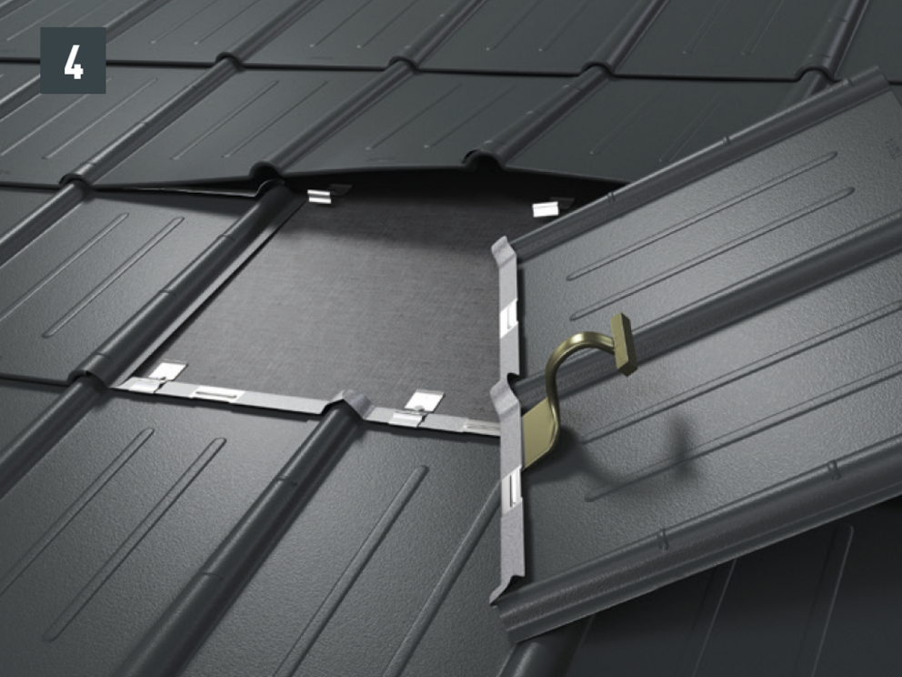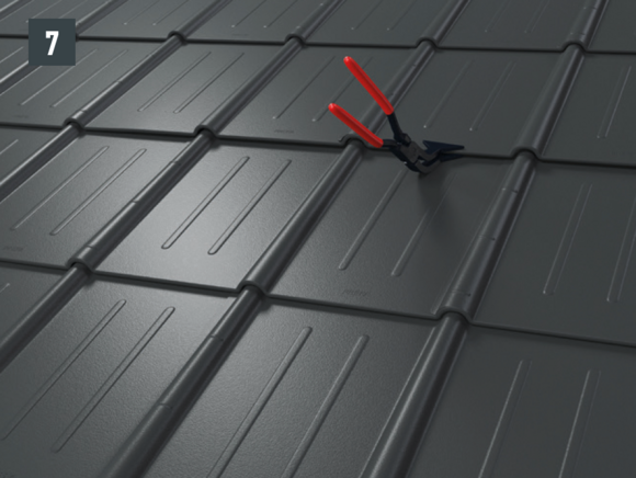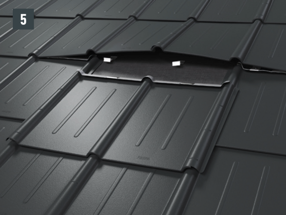 • Før du setter inn den nye takplaten, stram begge yttersporene og åpne den øvre falsen litt. Den nye platen kan tekkes med begge de laterale sporene over de andre (fig. 5) – unntak: i vinkelrenne- eller møneområdet.