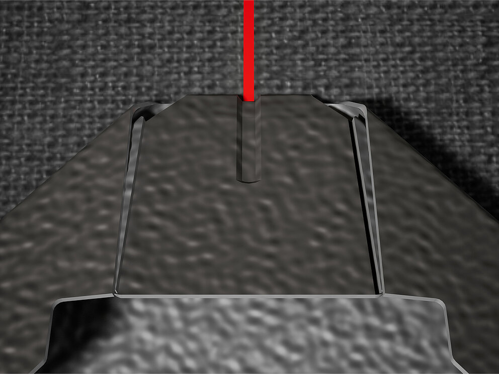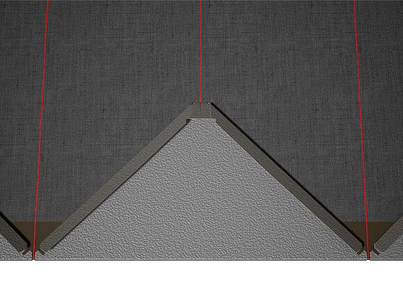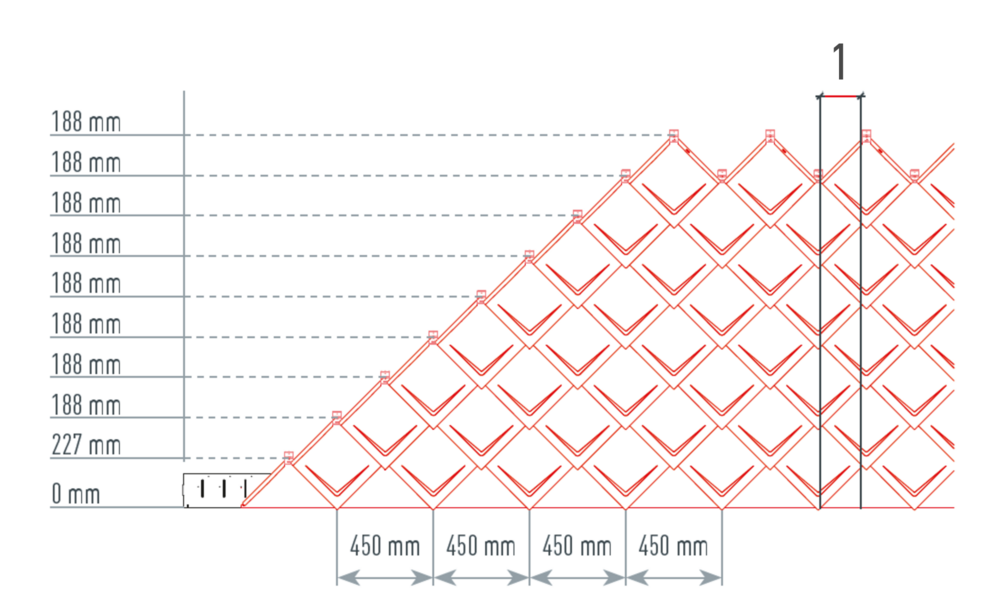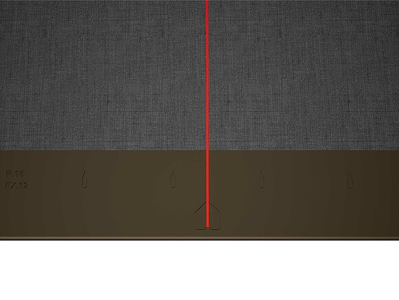 For å forenkle monteringen av PREFA-takromber 29 × 29 , anbefales det å lage et rutenett av vertikale snorslag med 450 mm mellomrom (markeringer i kantlister kan fungere som en veiledning). For å opprettholde snørelengden nøyaktig i hver rad, kan halve snørelengden også tegnes om nødvendig og kontrolleres med jevne mellomrom. Juster startplatene med hakkene (på øvre kant av startplatene) langs de vertikale snorslagene (se illustrasjonen nedenfor). Her gjøres det oppmerksom på at arealet for sideveis oppstilling (f.eks. utforming av kantsten) ikke er plassert sentralt i takrombene 29 × 29 (pass på symmetri/taksenter).