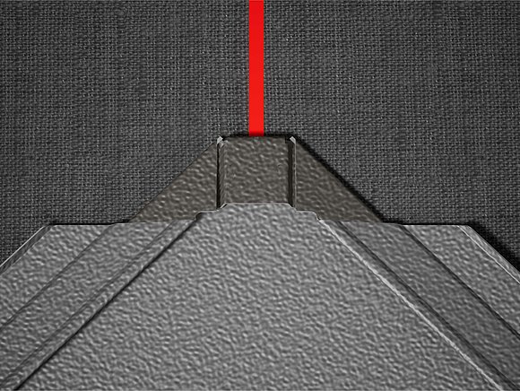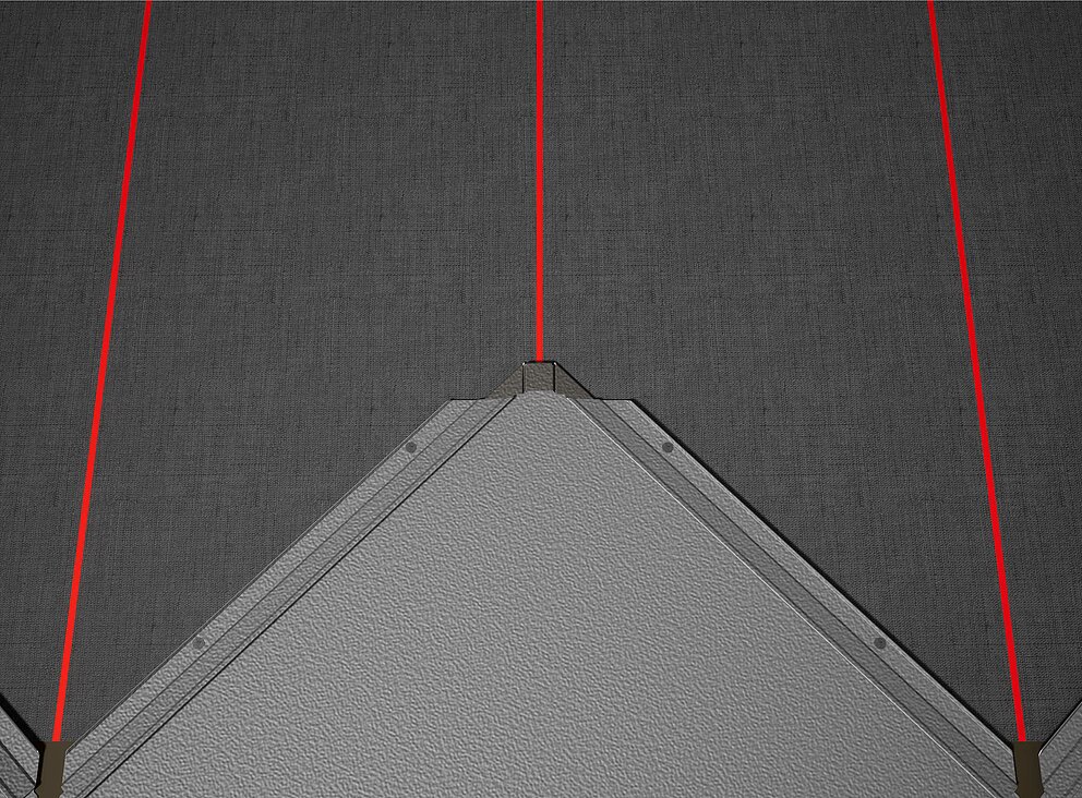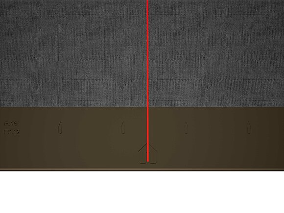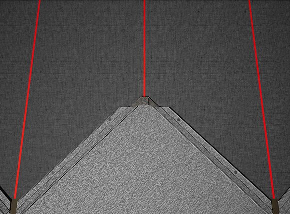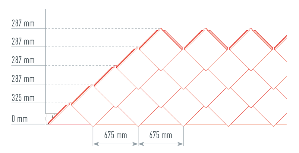 For å forenkle monteringen av PREFA-takromber 44 × 44 , anbefales det å lage et rutenett av vertikale snorslag med 675 mm mellomrom (markeringer i kantlister kan fungere som en veiledning). For å opprettholde snørelengden nøyaktig i hver rad, kan halve snørelengden også tegnes om nødvendig og kontrolleres med jevne mellomrom. Juster startplatene med markeringene (på øvre kant av startplatene) langs de vertikale snorslagene (se illustrasjon nedenfor). Her gjøres det oppmerksom på at arealet for sideveis oppstilling (f.eks. utforming av kantsten) ikke er plassert sentralt i takrombene 29 × 29 (pass på symmetri/taksenter).