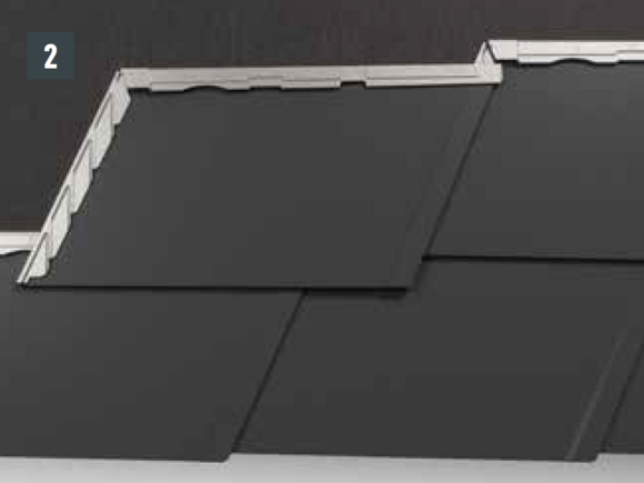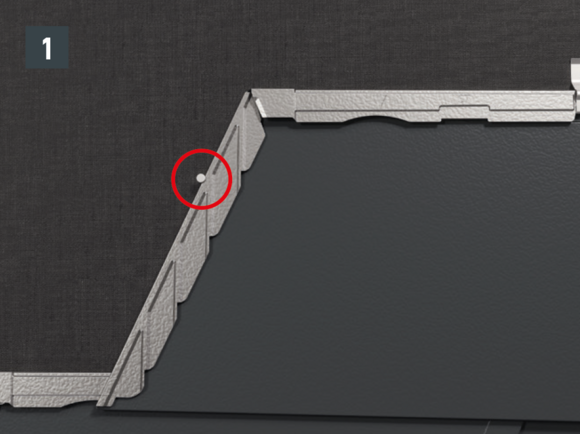 Formen på takshingel DS.19 resulterer i en senkning ved hælen på takshingelen. Bevar denne forsenkningen selv når du legger den første takshingel DS.19 i hver rad ved å ikke skyve den første takshingelen helt opp i kantlisten eller falsen. Senk hælen på den første takshingelen DS.19 til det øvre shingelomslaget går rett gjennom hele lengden.