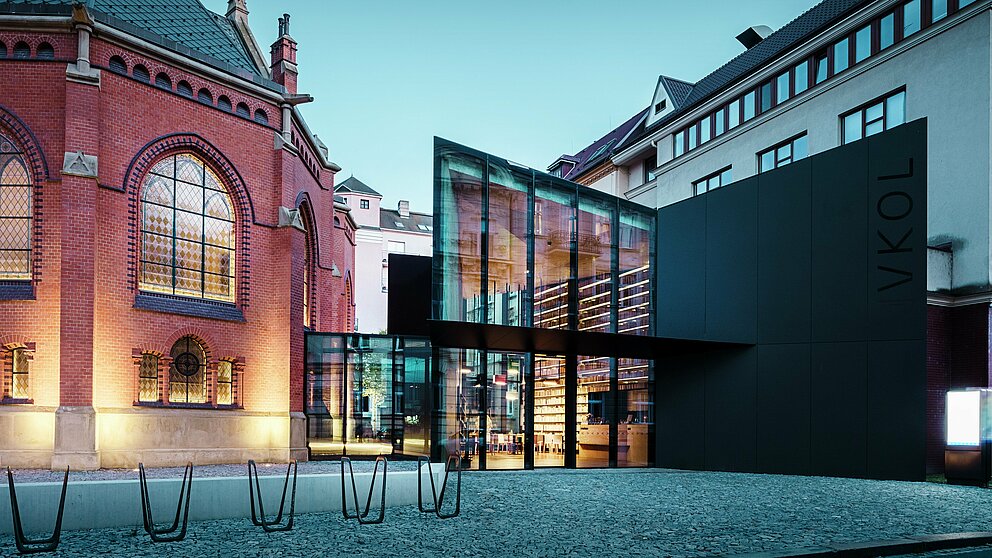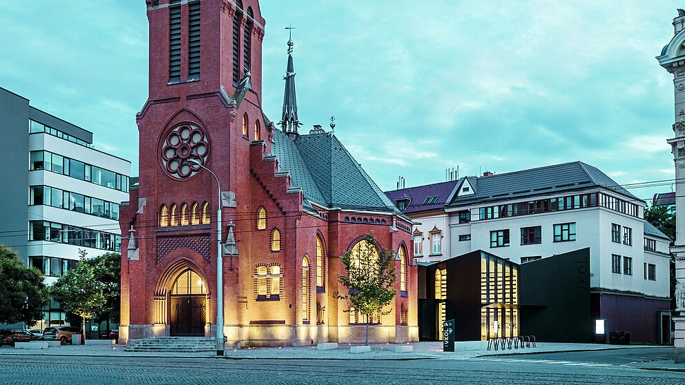 Når man vandrer gjennom Olomouc merker man straks den spesielle atmosfæren fra den historiske gamlebyen, den røde kirken og forskningsbiblioteket. Akkurat her oppstod et nybygg i 2023 som forbinder de to bygningene sammen på imponerende vis. Atelie-r, s.r.o løftet omgivelsene med en bygningsmasse i moderne form som respekterer historien. Arkitekt Miroslav Pospíšil beskriver utkastet som arbeid mellom fortid og nåtid, der kirken skulle få beholde sin ytre fremtoning med et dempet, selvstendig nybygg.